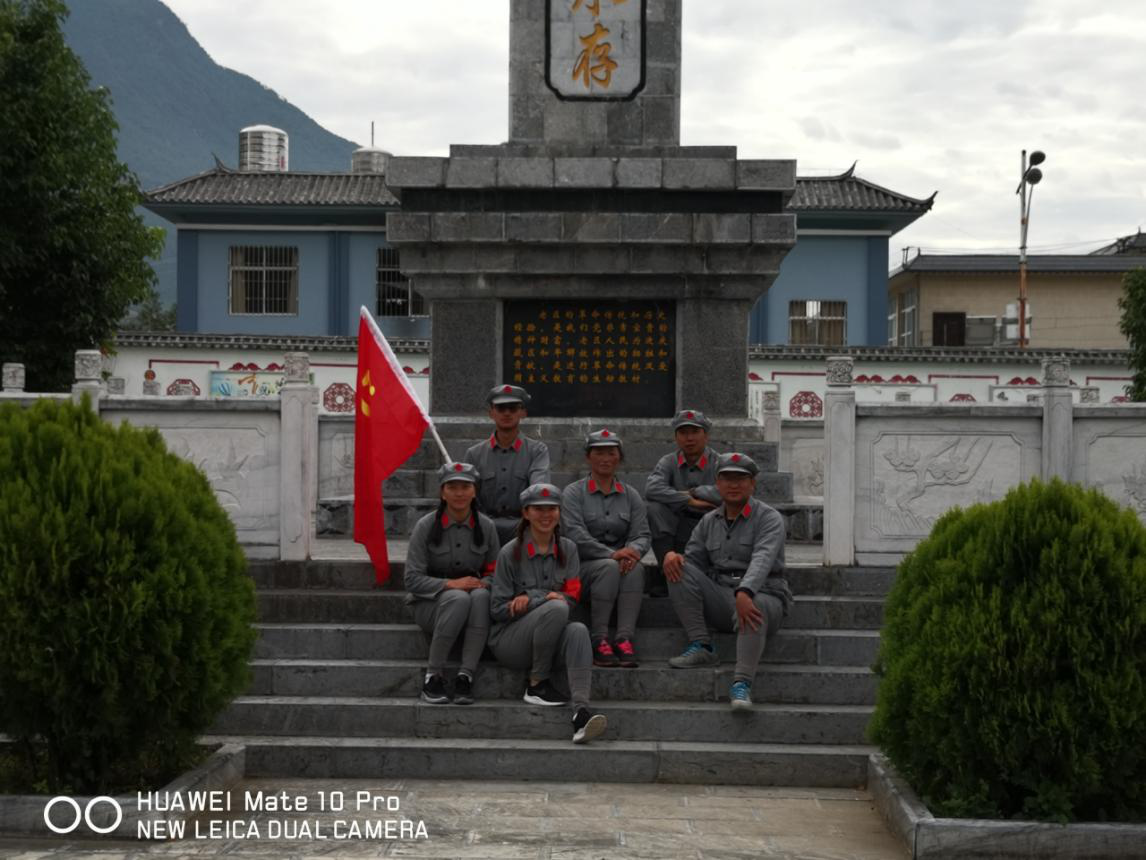 山径崎岖,蜿蜒而下,趟过“四道桥”行至干岩房,这里曾是红二、六军团先遣部队遭受中甸僧俗民团总指挥汪学鼎带领小中甸民团堵截的地方,参谋长高利国等12名红军战士英勇牺牲,团政委朱辉照也身负重伤,大家在革命遗址前合影纪念。
